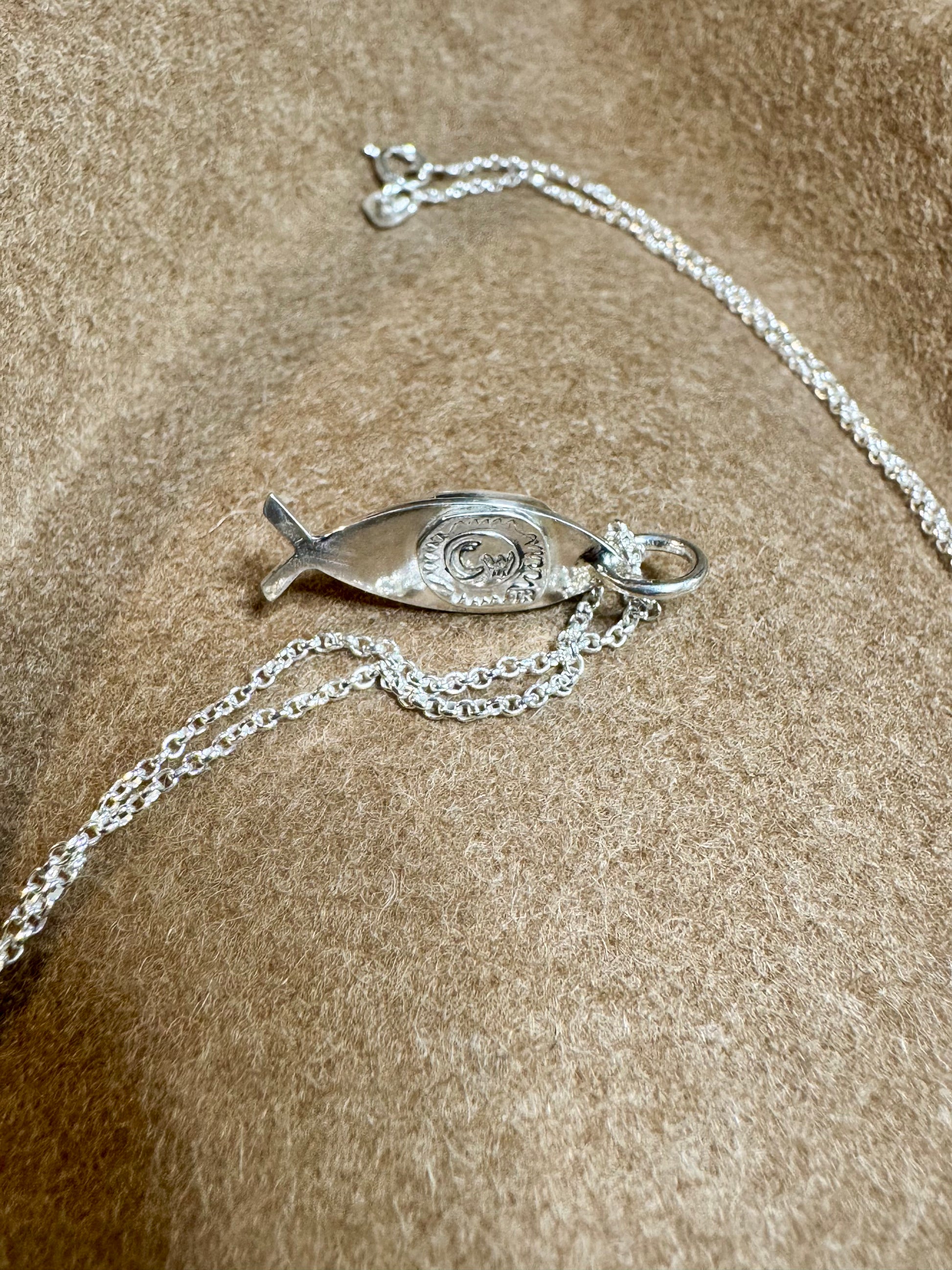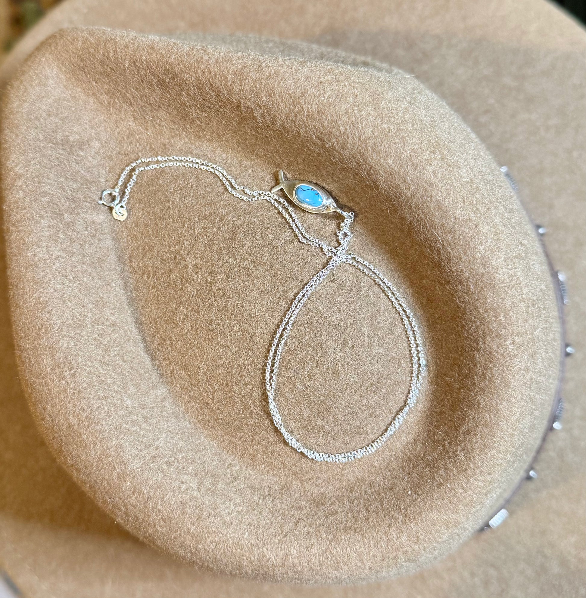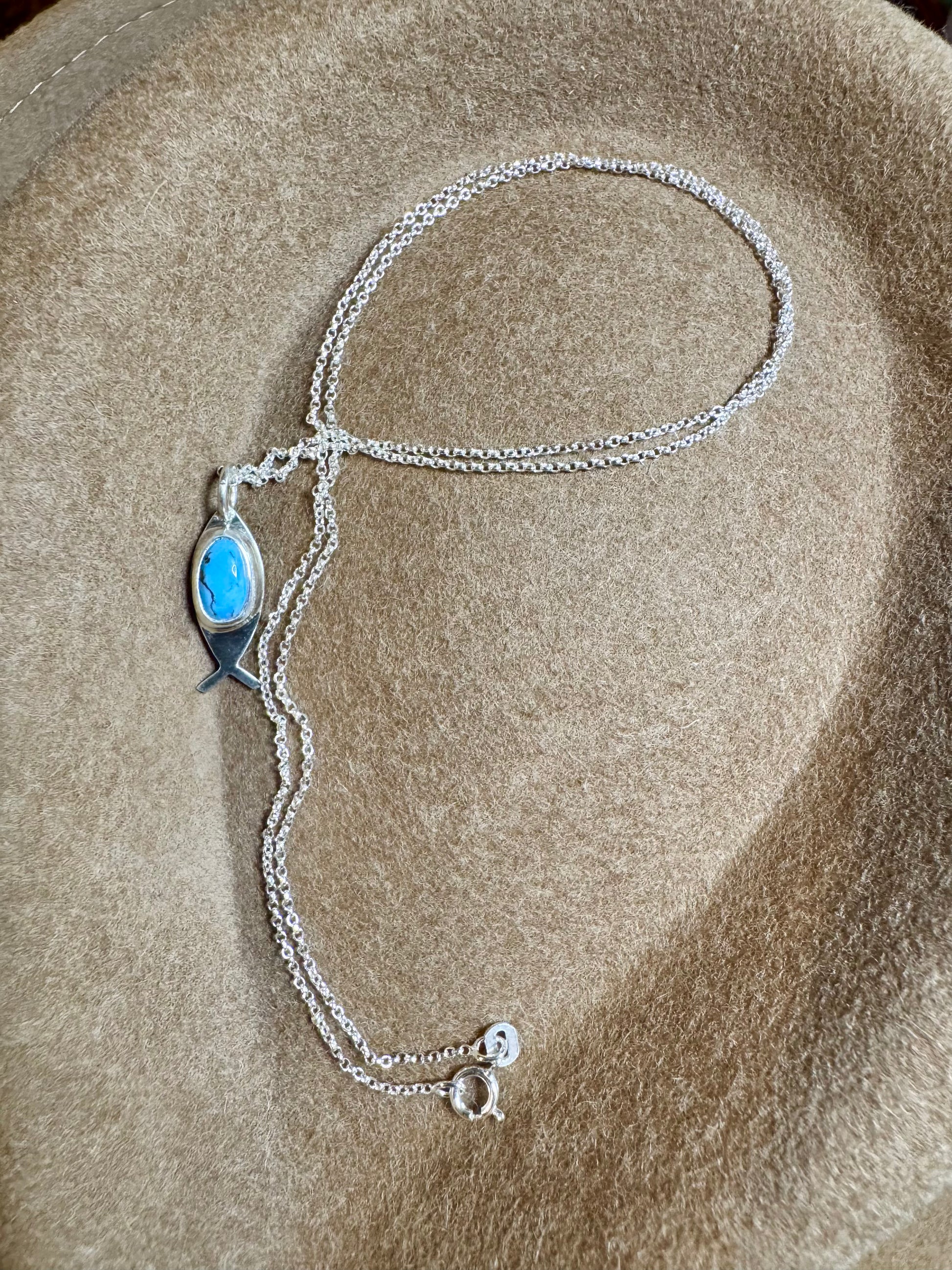 Sterling silver and turquoise Ichthys, also known as the “Jesus Fish.” Chain length is 20 inches