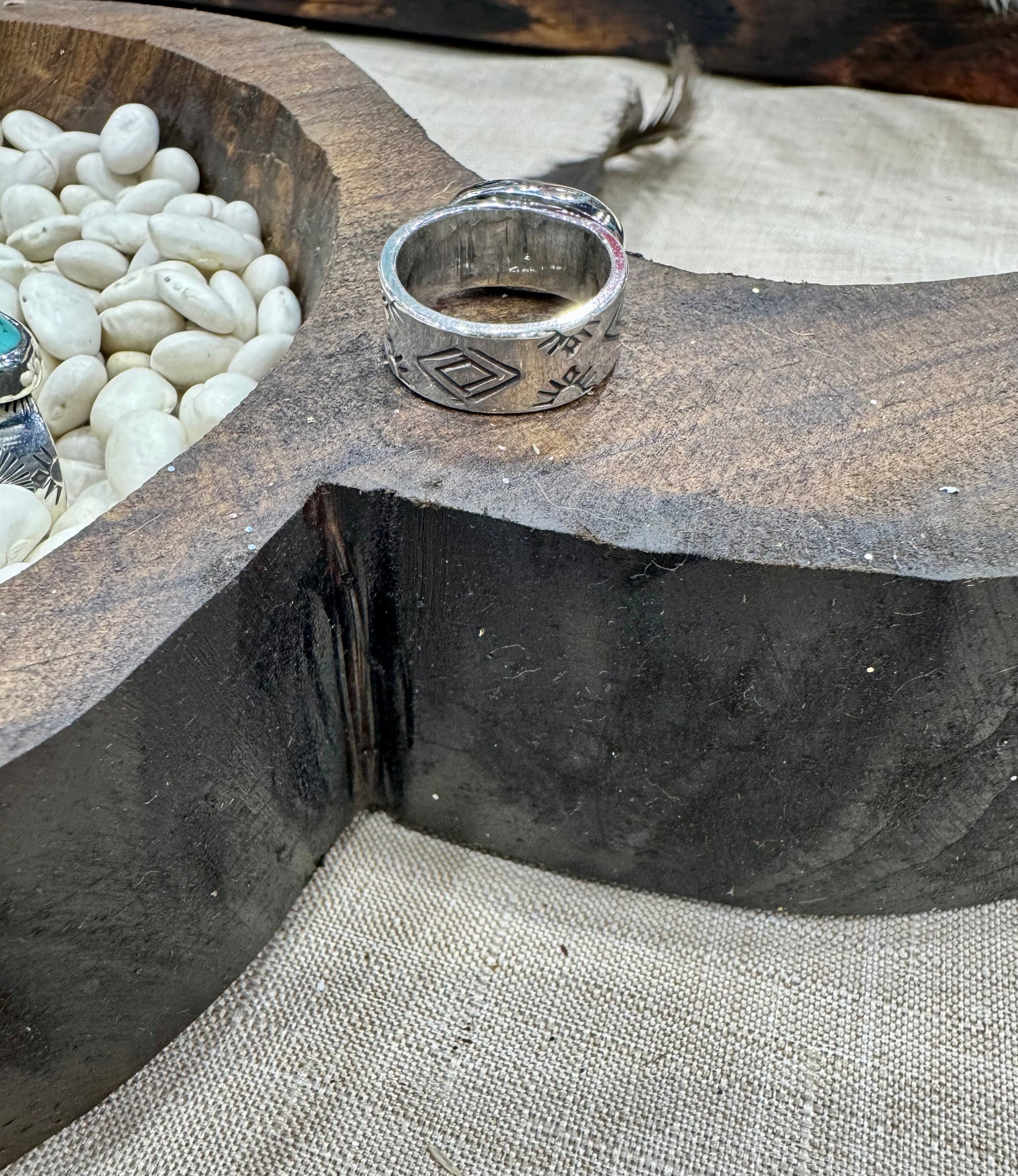 Sterling silver and Pilot Mountain Turquoise ring. The band is very heavy gauge with stamping.